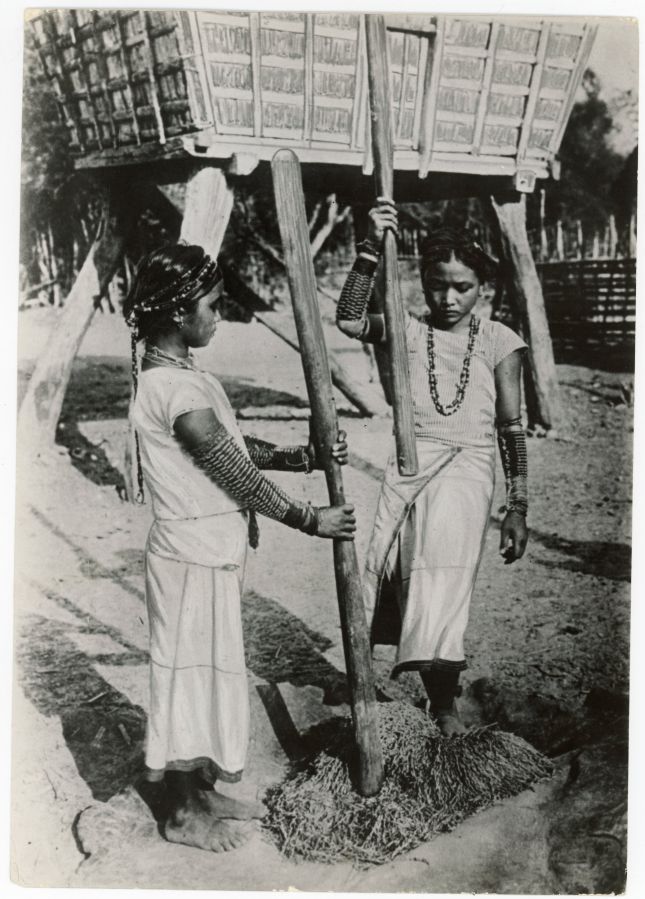 Two young Filipino girls pounding rice. (...)
