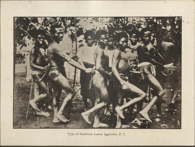 Subject: More likely Aeta (Negrito) than Igorot, given their appearance and geography, these men are dancing while holding bow and arrows. Givens was the post photographer