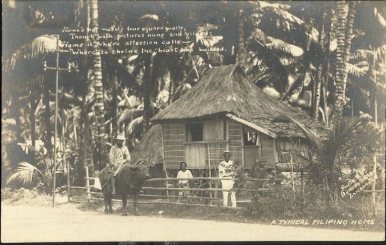 Subject: Man and woman stand, and man rides carabao, outside small nipa house next to utility pole. Poem on face.