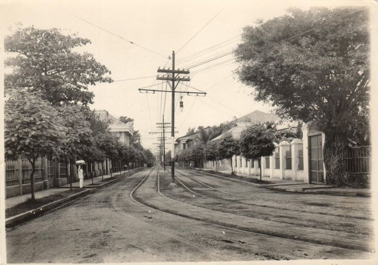 Subject: Empty General Solamo Street in San Miguel, Manila with streetcar tracks, power poles, and large gated homes. See also ROJR-000328 for a very similar printed postcard of this same view.