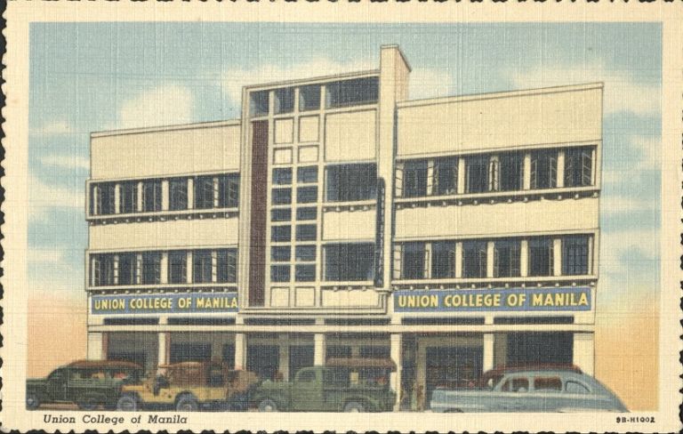 Subject: Union College of Manila. Modern 3-story building with mid-century cars in front.