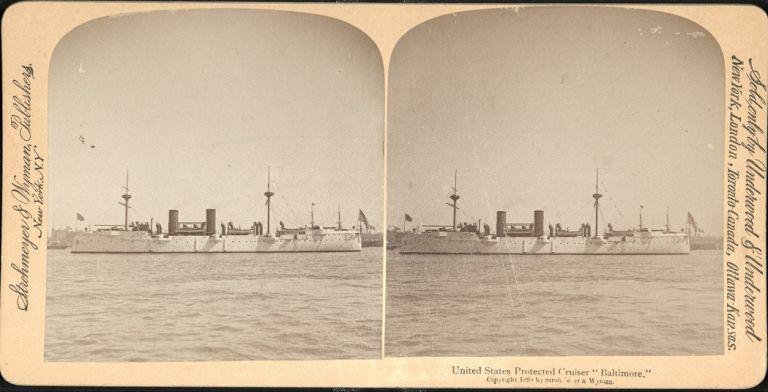 Underwood [unknown coding]. View of U.S.S. "Baltimore" in bay. "Baltimore" served in the Battle of Manila Bay and remained in the Philippines until 1900.