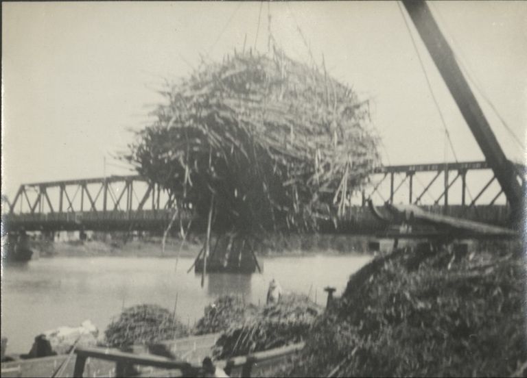 Subject: A simple wooden crane lifts a large bundle of sugarcane from barge on the Pampanga River. The railroad bridge at Calumpit is seen in the background (see also OFI-004293).