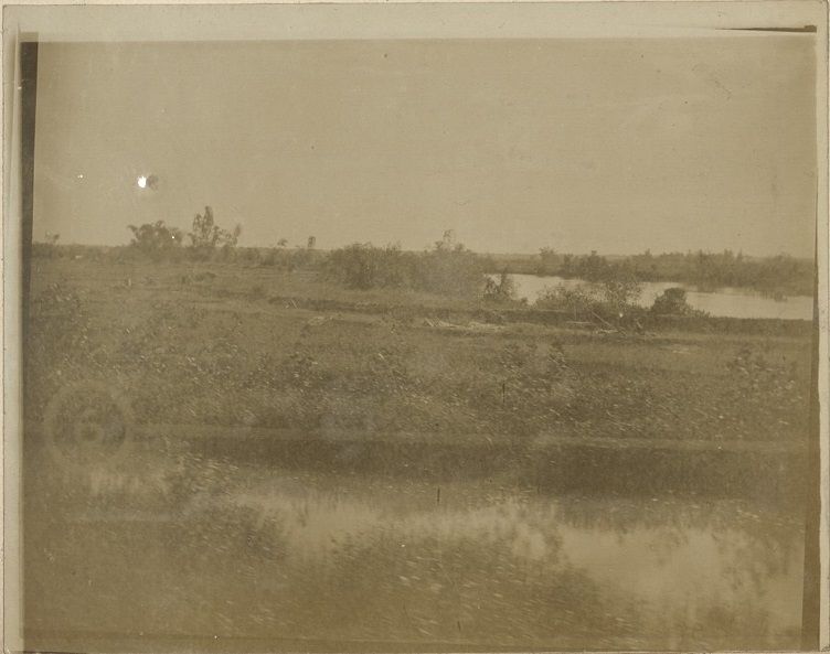 Subject: On the other side of this canal, below the big river, is a structure made of bamboo poles with possibly some canvas nearby. Why was this scene worthy of a photo? Nobody left a cap