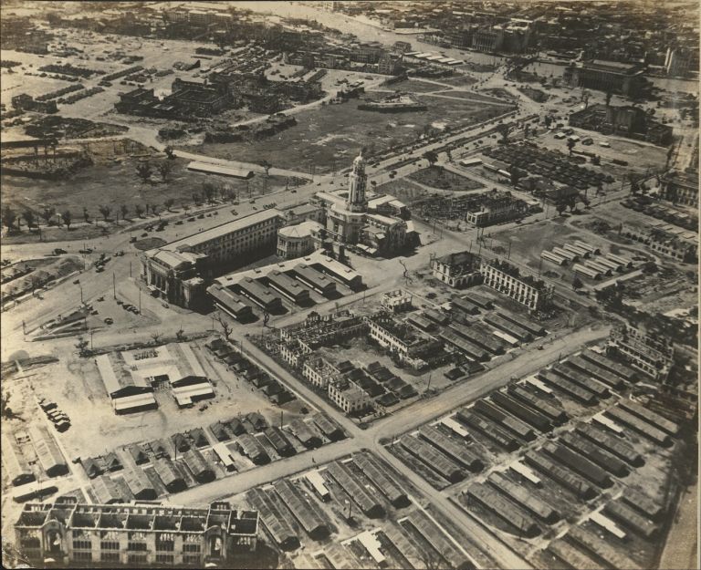 [Untitled - Aerial view of Manila City Hall and surrounding area, war-damaged].