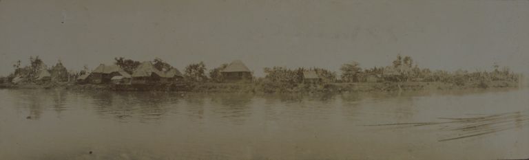 Subject: Nipa structures along the bank of the Pasig River. A gate (to a town or cemetery?) can be seen far left; interestingly, it appears to be the same one seen in ROJR-000420