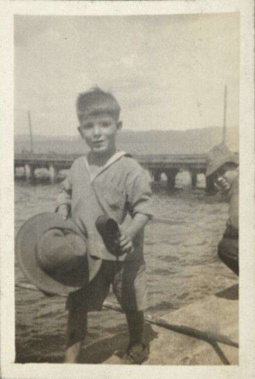 Subject: An American boy, son of a military officer, holds a hat on the shore with a pier in the background. Probably at Subic Bay.