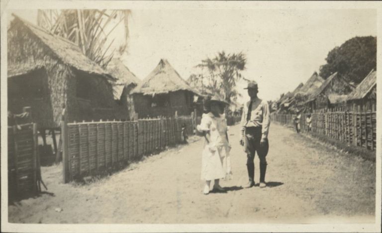 Subject: American Army officer poses with a women in a village street with tidy nipa huts behind bamboo fences. Perhaps this is Billie Kincaid and his wife, the creator of this album.