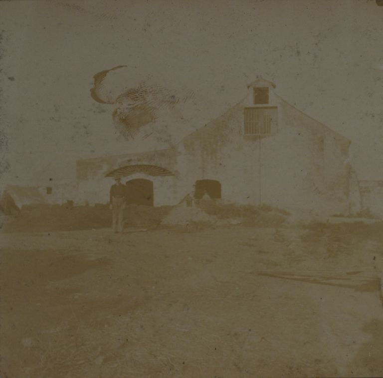 [Untitled - American poses outside a barn or factory - with abaca fibers?].