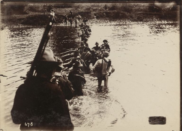 Subject: Line of U.S. soldiers cross a chest-deep river while on patrol during the Philippine-American War. Rifles are held aloft to keep them dry. See also OFI-002780 for an almost-identi