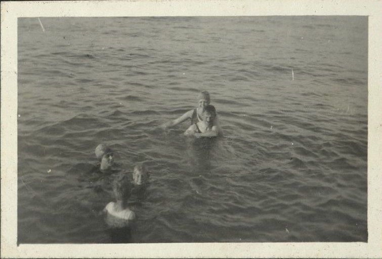 Subject: Children and their mothers, dependents of American servicemen, swimming. Probably at Grande Island in Subic Bay.