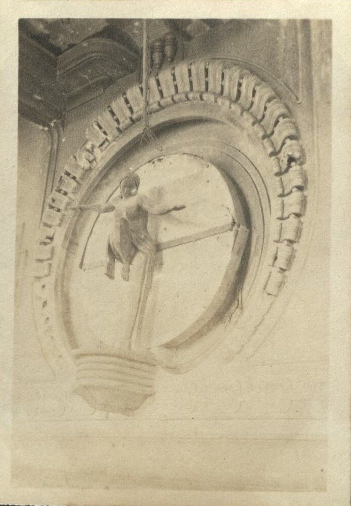 Subject: An architectural medallion or other stone carving from an unidentified building, which features a small sculpture of a crouching woman with her arms outstretched before a cross. Possibly this