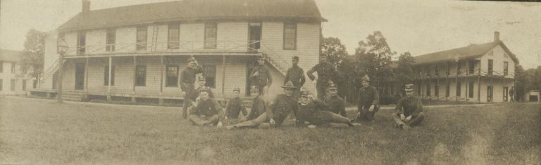 Subject: Soldiers pose at Vancouver Barracks in Washington State (see OFI-002096). Established in 1849, the Vancouver Barracks was the first U.S. Army base location on the Pacific Coast no