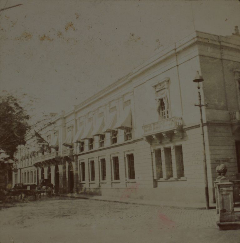 Subject: View looking down facade of Ayuntamiento de Manila building located at the corner of Andr�s Soriano Avenue (formerly Calle Aduana) and Cabildo Street, fronting Plaza de Roma in Int