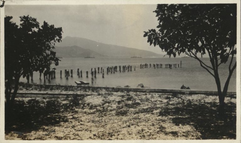 [Untitled - Beach, old pilings, warships in channel, Subic Bay?].