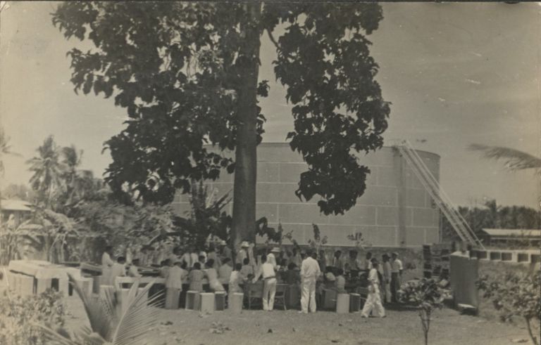 Subject: A group of people gathered around tables under a huge tree in front of a storage tank - all that's missing is a caption. Since Harry Hawkins worked for Socony-Vacuum Oil Co., we can
