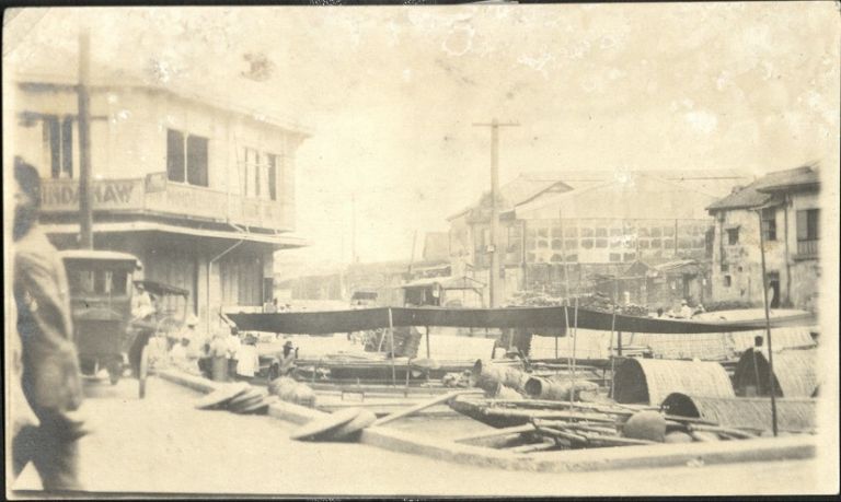 Subject: Boats docked at a wharf likely on the Pasig River in Manila. Building to left looks similar to ROJR-001687, which would make this the wharf below the Bridge of Spain.
