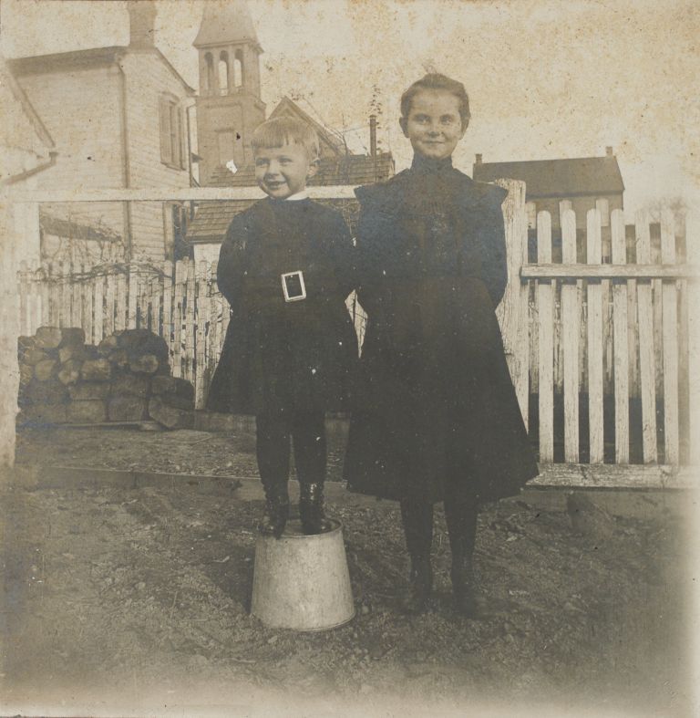 Subject: Typical backyard scene in the U.S., two children (possibly offspring or relatives of our photographer) pose in some costume. They look like pilgrims, so this may be for a Thanksgiv
