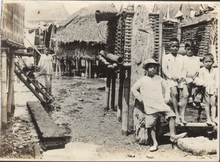 Subject: A group of Filipino boys pose outside nipa huts in a village after rains (or, near the seashore). This image has not been matched with a caption from the typewritten original list yet.