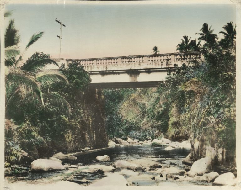 Subject: A short bridge spans a narrow gorge and small Philippine river. During the early period of American rule, the Bureau of Public Works created bridges big and small using moder