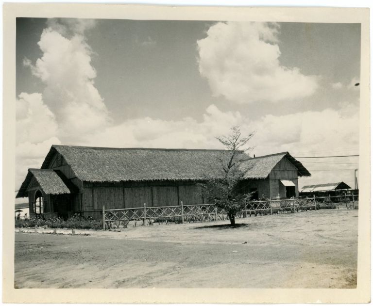 Unidentified building with thatched roof and tidy bamboo fence. By album sequence this should be at Clark Air Base or Angeles in the late 1940s.