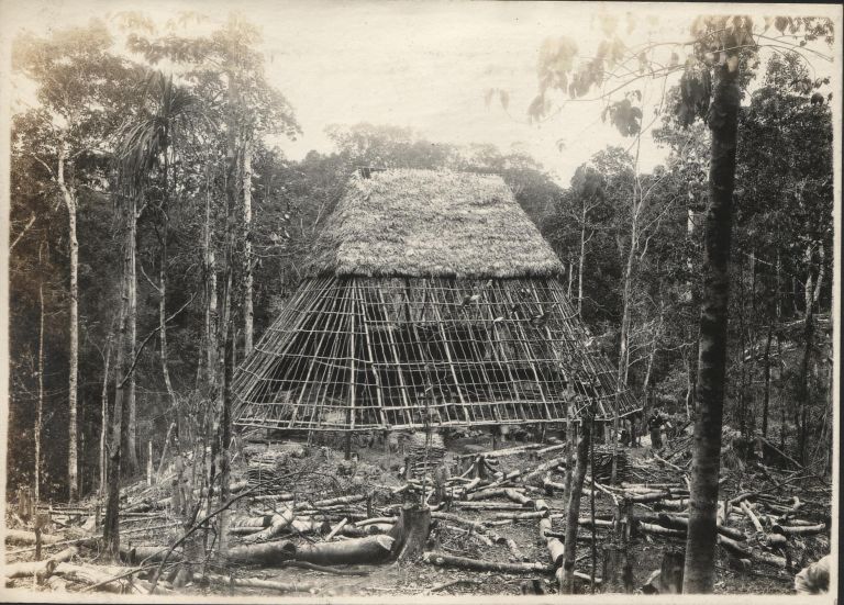 Subject: Workers are tying thatch onto a large roof structure, possibly on Negros Island. Many such roofs are assembled then carried to their final destination, but this activity, being in a forest cl