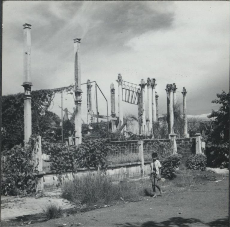 Subject: A Filipino child walks by the burned-out ruins of a building, likely detroyed by fire during the battle for the liberation of Manila in Feb. 1945. Only the columns and some metal framework re