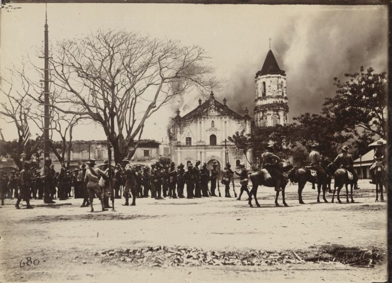 Subject: Smoke from the burning headquarters of Aguinaldo rises behind the church in Malolos. American soldiers control the plaza. See also OFI-003326 for this same image as a halftone pri