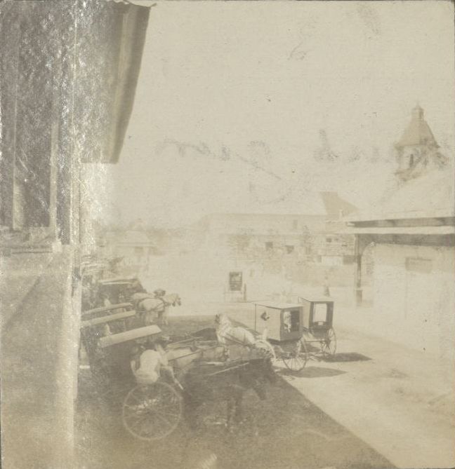 Subject: Cocheros with their calesas wait for passendgers on the shady side of the street. The bell tower is distinctive but does not appear to match any in Cavite or Intramuros.
