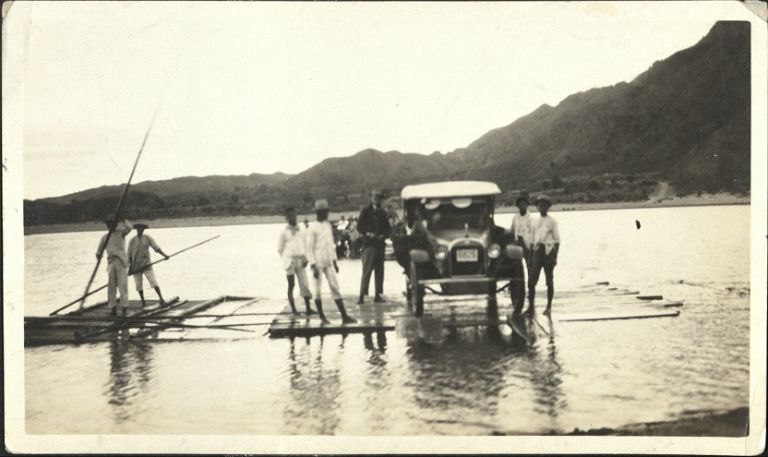 Subject: Circa 1920 automobile floats agross a river on a bamboo raft.