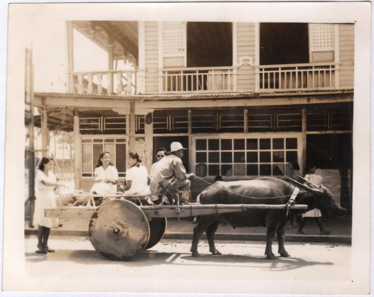The unmechanized forerunner to the jeepney - young Filipinas climb on board a carabao-drawn cart, complete with opposite-facing benches, to catch a ride in town.