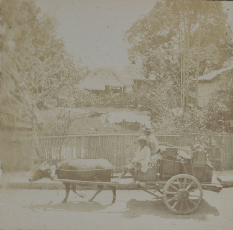 [Untitled - Carabao and cart in village].
