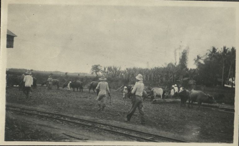 Subject: This series of three images (OFI-006311/12/14) shows carabao and men riding on a sugar central (per the narrow rail tracks), very likely on Negros Island where Mr. Thurlow worked. Since there