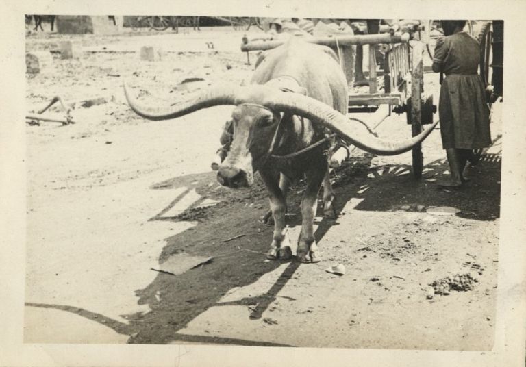 [Untitled - Carabao with exceptionally long horns pulling cart].