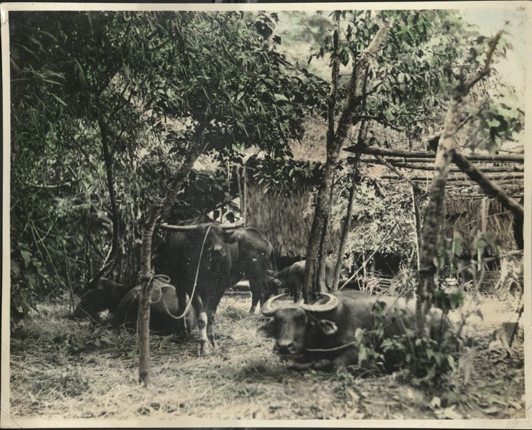 [Untitled - Carabao tied to small trees near a nipa hut].