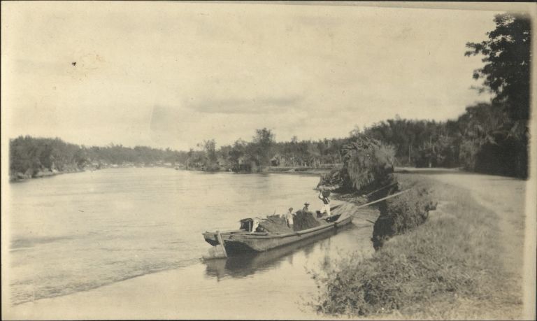 Subject: Men load a casco (freight barge) with cargo using baskets at a river landing in the Philippines.