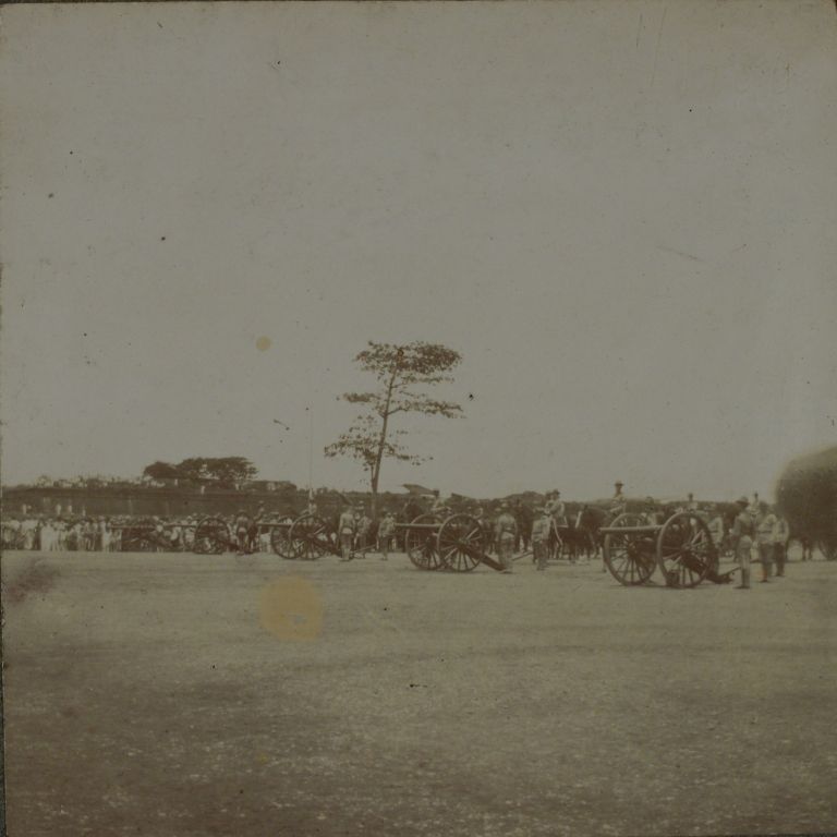 Subject: Artillery displayed in a large field for review, traing, or practice during the Philippine-American War.