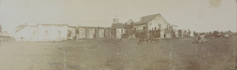 Subject: Horses graze near a captured cannon in Kawit (formerly Cavite El Viejo). Behind is the back of partially-destroyed St. Mary Magdalene Church of Kawit, Cavite, also known as Kawit
