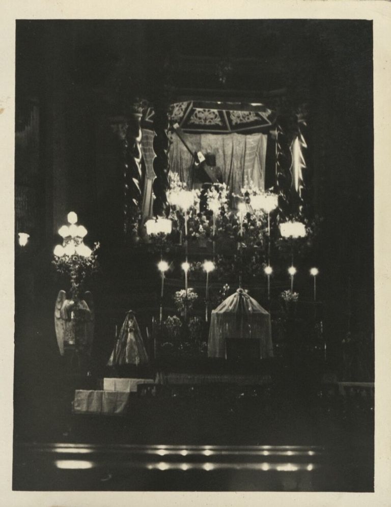 Subject: This appears to be an altar or shrine at a church or chapel, light by candlelight. No location is given by Mr. Finney. See also ROJR-000524.