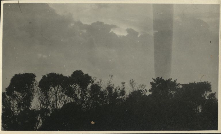 Subject: Trees silhouetted agains claods and what was probably a colorful sunset, had color film been more widely available to record it. Possibly taken along the road up to Baguio. See also OFI-00620