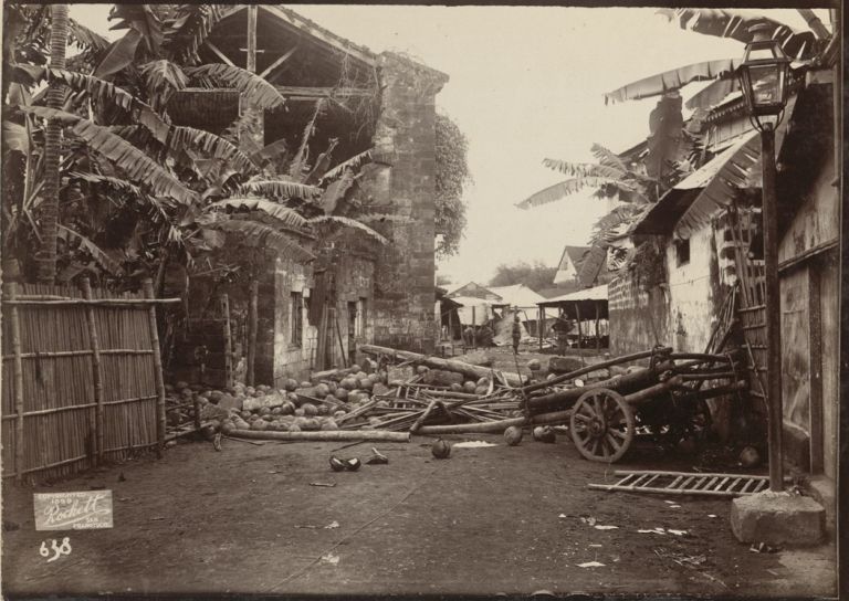 [Untitled - Cocoanut [Coconut] breastworks thrown up in the streets at Pasig. Also destruction by artillery fire].