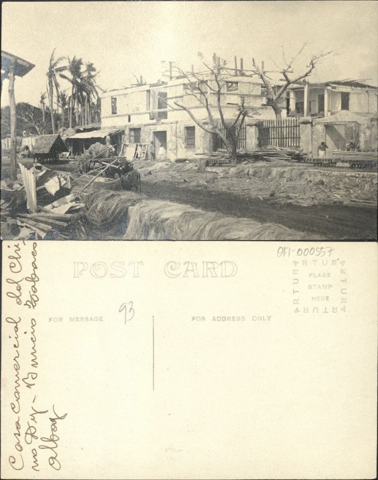 Commercial building under construction in Tabao, Albay province; carabao and cart on road, and abaca (hemp) fibers drying on both sides of road.