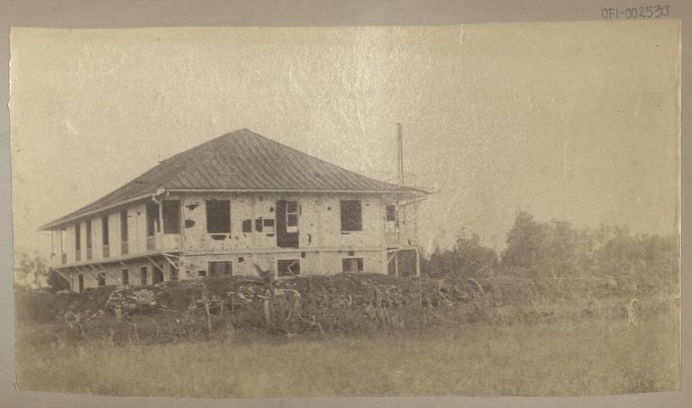 Subject: This appears to be a different angle of OFI-003418 entitled "Convent at Fort Malate, near Manila; damaged by the American guns in storming the Fort." The fort was originally built in 1584 i