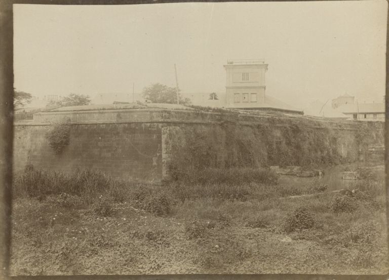 Subject: An unidentified corner of the city walls of Intramuros in Manila. The weed-choked moat was a prime breeding ground for disease and was filled in during the American period.