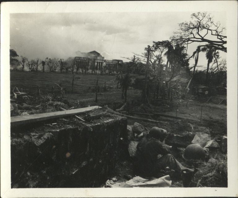 [Untitled - Destruction in Manila during liberation: Artillery shelling City Hall and the Legislative Building, February 1945].