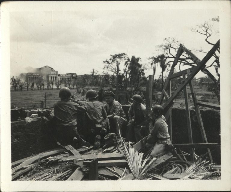 Subject: U.S. soldiers and observers watch from amid the rubble atop Intramuros walls as artillery pounds the Japanese strongpoints of City Hall (left, out of picture) and the Legislative Building (le