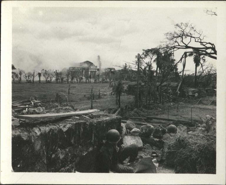 Subject: U.S. soldiers and observers watch from amid the rubble atop Intramuros walls as artillery pounds the Japanese strongpoints of City Hall (far left, obscured by smoke) and the Legislative Build