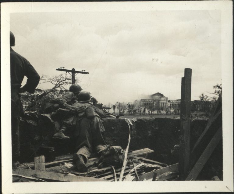 Subject: U.S. soldiers fire a light machine gun from amid the rubble atop Intramuros walls as artillery pounds the Japanese strongpoints of City Hall (left, obscured by tree) and the Legislative Build