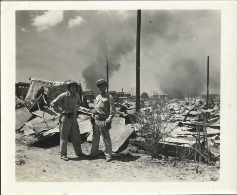 Subject: Destruction in Manila during the battle for liberation in February, 1945. Two U.S. officers stand in front of ruined buildings as smoke from distant fires rise behind them.