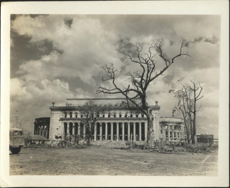 Subject: The burned-out shell of the Manila Post Office building, used by the Japanese as a strongpoint to fire on the liberators, stands as a bleak reminder not just of the ferocity of the battle but